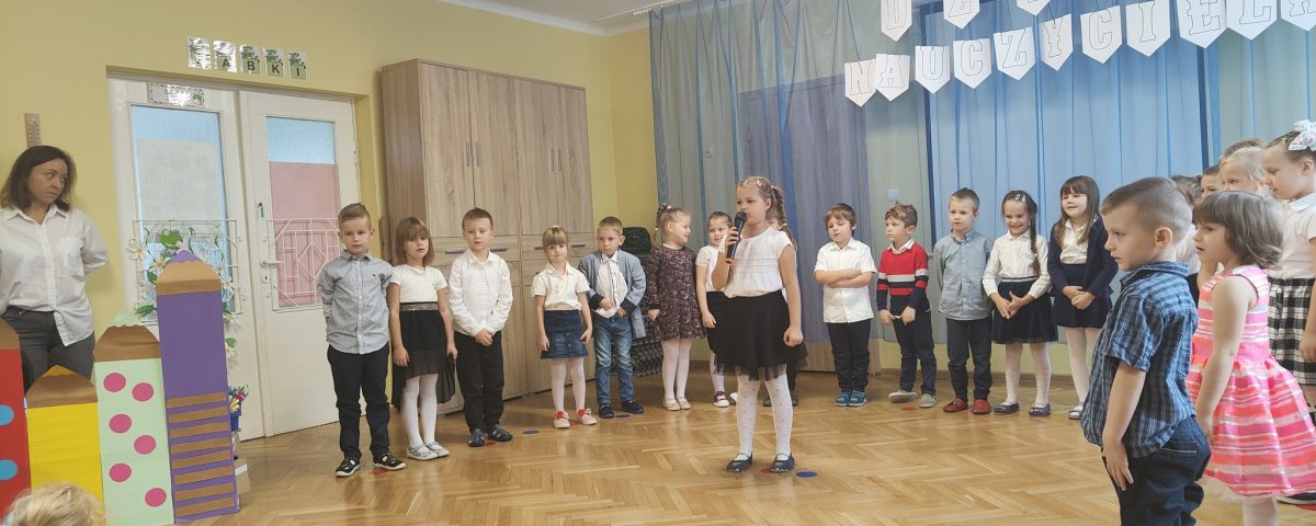 Grupa dzieci 6 – letnich chcąc uczcić Dzień Edukacji Narodowej przygotowała dla całej społeczności przedszkola wstęp artystyczny.” Żabki ” zaprezentowały wszystkim wierszyki, piosenki i tańce.