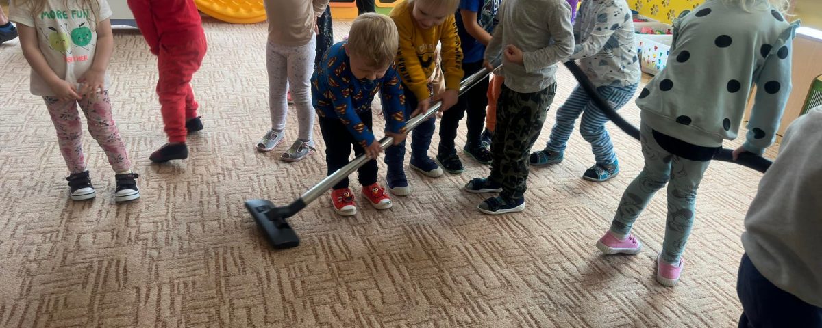Najlepsza nauka, to ta przez własne doświadczenia, przez działanie. Pszczółki poznawały zasady bezpiecznego korzystania ze sprzętu elektrycznego (domowego). Przy okazji wspólnie posprzątały całą salę.