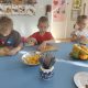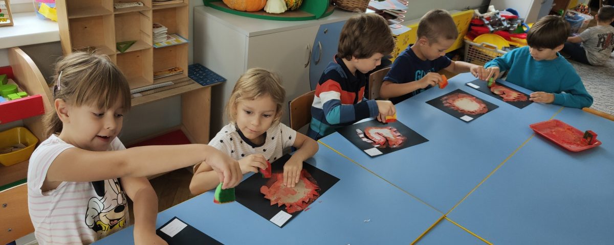 Prace plastyczne u Żabek. Grupa „Żabki” bardzo chętnie uczestniczy w proponowanych przez nauczycielki aktywnościach plastycznych. Przy okazji artystycznych zabaw dzieci mają możliwość rozwijania swoich umiejętności manualnych i estetycznych. Dzieci tworzą zarówno indywidualne jak i grupowe prace, które sprzyjają rozwijaniu współdziałania.