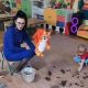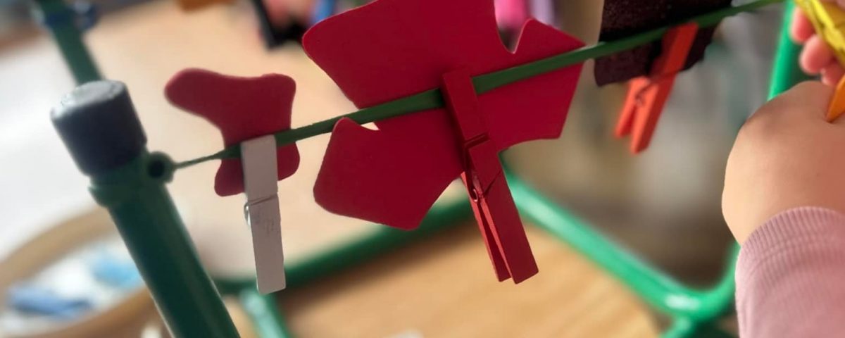 „Wielkie jesienne pranie” u Pszczółek. Zabawa zręcznościowa, usprawniająca chwyt pensetkowy – niezmiernie ważny np. przy umiejętności pisania.