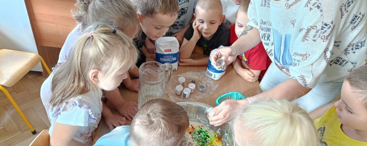 „Jesienna ciecz nienewtonowska” – przedszkolaki podczas zabawy utrwalały cechy charakterystyczne jesieni.