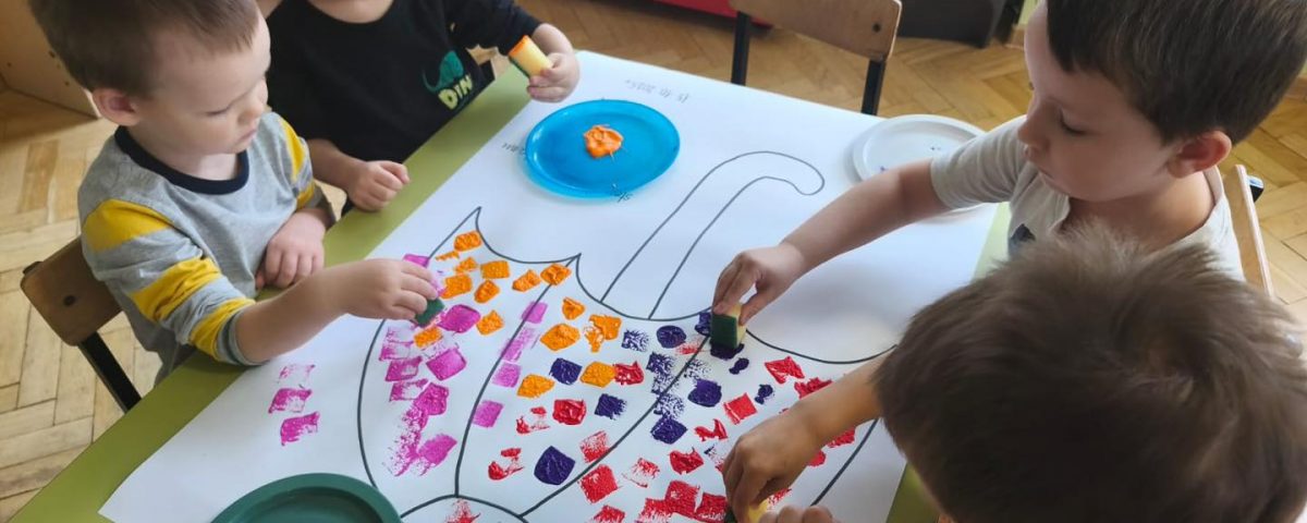 Maluszki podczas zajęć plastycznych wykonały dziś piękny, kolorowy parasol. Dzieci stemplowały gąbeczkami, tworząc barwne wzory i ćwicząc swoje małe rączki. Przy okazji pracy artystycznej „Misie” utrwalały nazwy kolorów i rozmawiały o jesiennej pogodzie.