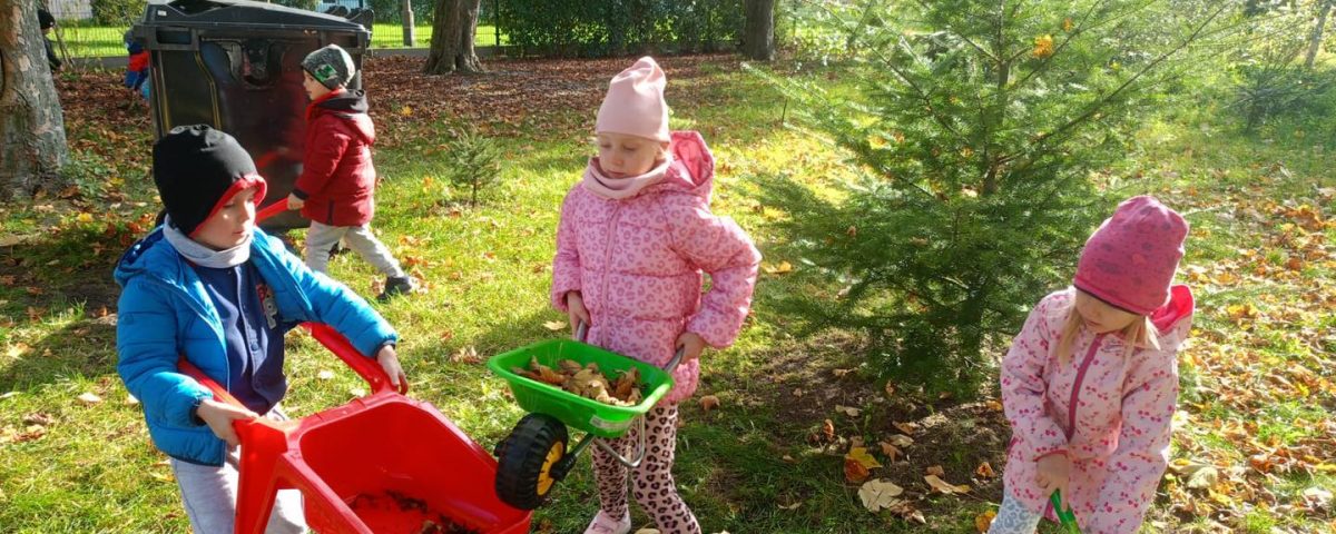Dzieci z grupy „Rybki” pomagały Panu Michałowi w grabieniu liści w ogrodzie przedszkolnym i świetnie się przy tam bawiły.
