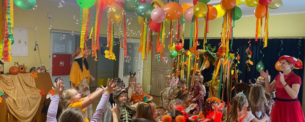 Dnia 29 października 2025 roku w naszym przedszkolu odbył się Bal Jesienny. Sala przedszkolna zamieniła się w bajkową, jesienną krainę – pełną złotych liści, dyń i kasztanów. Przedszkolaki przyszły w niezwykłych przebraniach: były muchomorki, jabłuszka, dynie, sowy, wiewiórki, liski czy niedźwiadki. Dzieci tańczyły w rytm wesołej muzyki, brały udział w zabawach ruchowych i konkursach, a ich energia i radość tworzyły niezwykłą atmosferę. Bal przebiegał w przyjaznej, ciepłej atmosferze, a każdy uczestnik mógł poczuć się wyjątkowo. To był piękny dzień, który przypomniał nam, jak wiele radości potrafi przynieść wspólna zabawa!