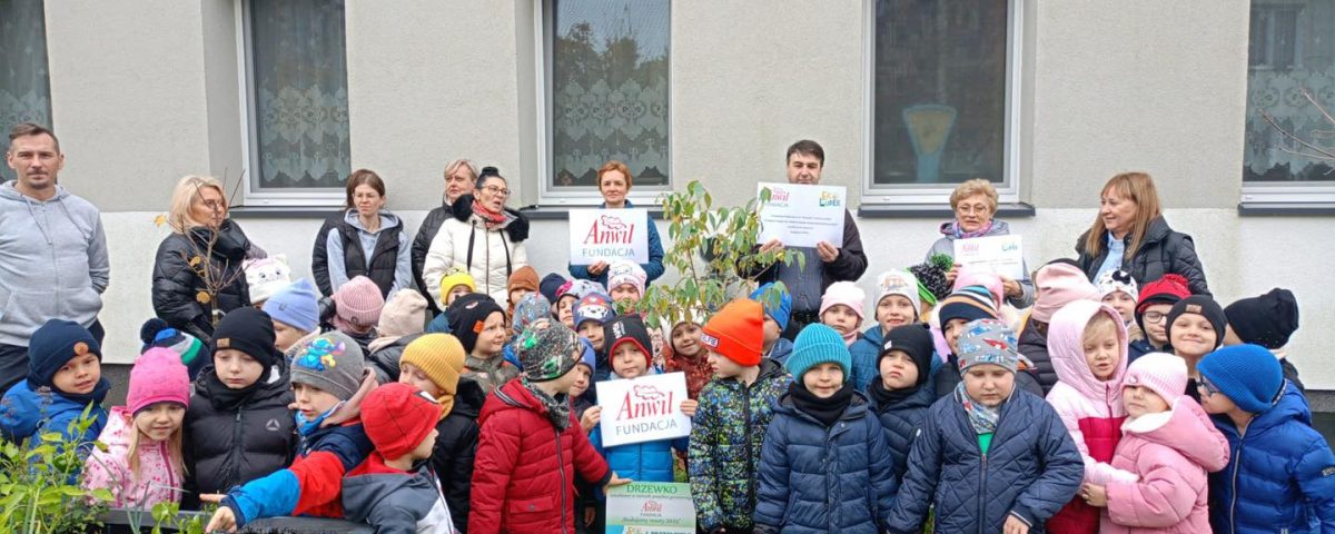 Wspólne zasadzenie drzewek Przedszkolaków z Seniorami przed Przedszkolem w ramach projektu „Ekoludki i Przyjaciele – Razem dla Sportu, Przyjaźni i Przyrody” w ramach programu granatowego „Budujemy Mosty 2025”