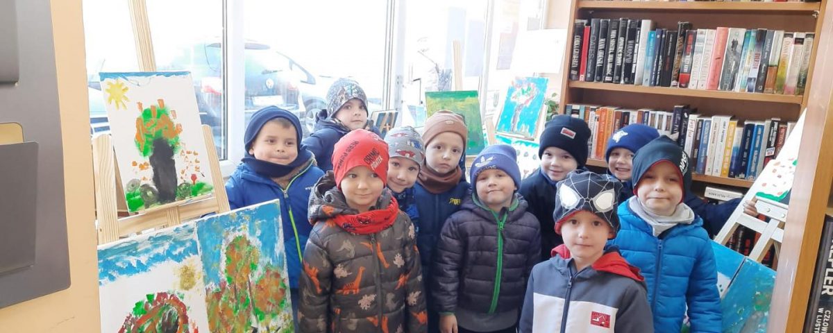 Oglądanie przez dzieci z grupy „Rybki” wystawy prac plastycznych pt. „Przyjaciel drzewa” zorganizowanej w Miejskiej Bibliotece Publicznej Filia nr 9 w ramach projektu ,,Budujemy mosty 2025″.