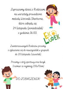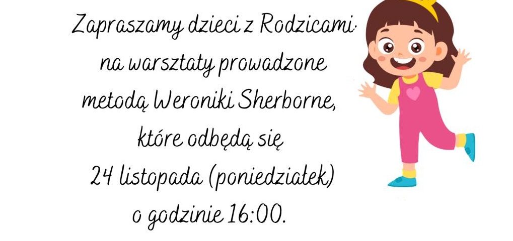 Zapraszamy dzieci z Rodzicami na warsztaty prowadzone metodą Weroniki Sherborne, które odbędą się 24 listopada (poniedziałek) o godzinie 16:00.