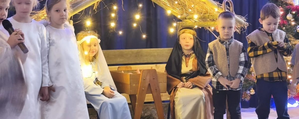 16 grudnia dzieci z grupy „Rybki” zaprezentowały Rodzicom Przedstawienie Bożonarodzeniowe, podczas której wybrzmiały słowa „Weź opłatek do ręki, taki kruchy, biały. On niesie pojednanie ludziom i ziemi całej”. Życzymy wszystkim zdrowych, spokojnych i radosnych Świąt Bożego Narodzenia a w nadchodzącym Nowym Roku szczęścia i pomyślności.
